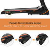 - [Adjustable Incline Level& Speed]The inclination of this treadmill could be manually adjusted in 3 levels , helps you burn more calories, tone more muscle, and build greater endurance. Running speed of this treadmill could be adjusted from 0-9MPH(0-14.8KM/H). You could choose different speed base on different workout purposes.